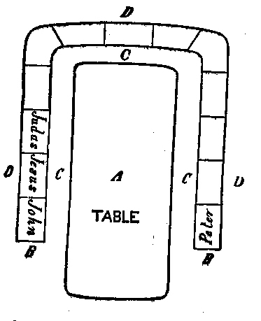 From the Gospel-narratives we infer, that St. John must have reclined next to Jesus, on His Right Hand, since otherwise he could not have leaned back on His Bosom. This, as we shall presently show, would be at one end - the head of the table, or, to be more precise, at one end of the couches. For, dismissing all conventional ideas, we must think of it as a low Eastern table. In the Talmud,9 the table of the disciples of the sages is described as two parts covered with a cloth, the other third being left bare for the dishes to stand on. There is evidence that this part of the table was outside the circle of those who were ranged around it. Occasionally a ring was fixed in it, by which the table was suspended above the ground, so as to preserve it from any possible Levitical defilement. During the Paschal Supper, it was the custom to remove the table at one part of the service; or, if this be deemed a later arrangement, the dishes at least would be taken off and put on again. This would render it necessary that the end of the table should protrude beyond the line of guests who reclined around it. For, as already repeatedly stated, it was the custom to recline at table, lying on the left side and leaning on the left hand, the feet stretching back towards the ground, and each guest occupying a separate divan or pillow. It would, therefore, have been impossible to place or remove anything from the table from behind the guests. Hence, as a matter of necessity, the free end of the table, which was not covered with a cloth, would protrude beyond the line of those who reclined around it. We can now form a picture of the arrangement. Around a low Eastern table, oval or rather elongated, two parts covered with a cloth, and standing or else suspended, the single divans or pillows are ranged in the form of an elongated horseshoe, leaving free one end of the table, somewhat as in the accompanying woodcut. Here A represents the table, B B respectively the ends of the two rows of single divans on which each guest reclines on his left side, with his head (C) nearest the table, and his feet (D) stretching back towards the ground.